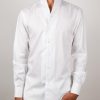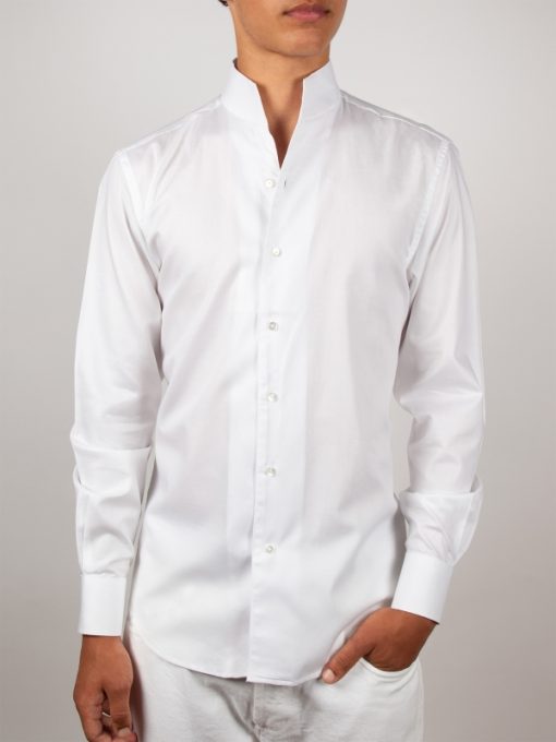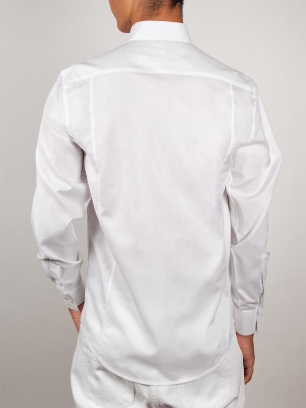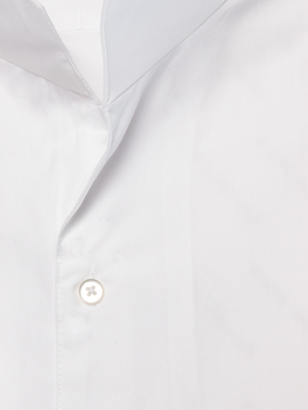 Crafted from smooth, structured white poplin, this shirt blends simplicity and modern elegance. Its tailored straight cut creates a sharp silhouette, while the stand-up collar adds a refined contemporary touch. Finished with simple cuffs, the clean design offers a minimalist look without compromising on style.