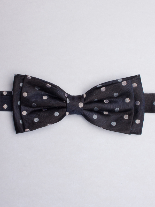 c We solved the problem and mixed both! This grey bow tie with two-tone polka dots will go perfectly with a light blue shirt and a night blue suit.
