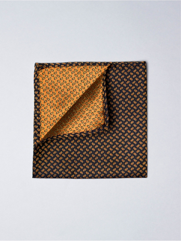 Add some vitamins to your outfit, thanks to this deep blue silk pocket with orange Paisley patterns. Success guaranteed with a grey jacket. Elegance and harmony.