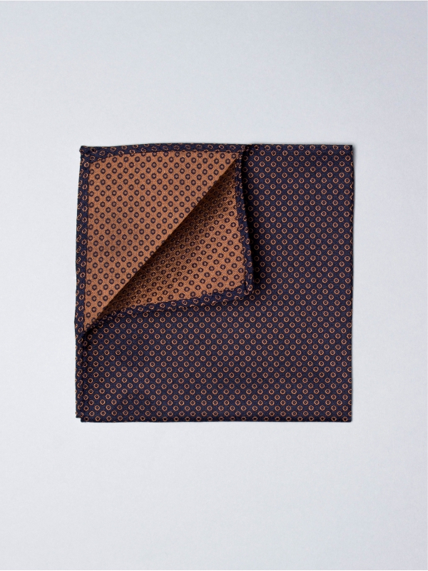 Unmistakable and irresistible, the legendary navy pocket is as elegant as simple. Its orange woven circles and its blue silk make it a vital piece of your wardrobe.