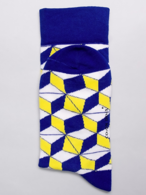 Step into a geometric dream with these socks featuring a captivating 3D cube pattern. As you move, the cubes seem to shift and dance, creating a mesmerizing visual play that adds depth and dimension to your style. Let every step be a journey through a world of spatial wonder.The model wears a size 38-41.