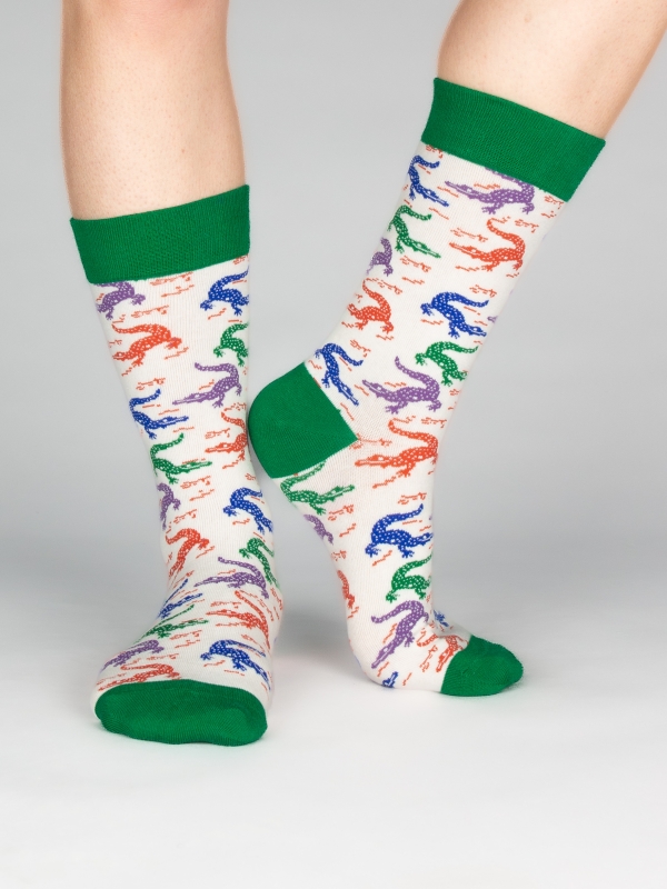 Tackle your day with these bold crocodile-print socks, where every step roars with confidence. Perfect for those who want to leave a playful mark wherever they go. The warm tones pair beautifully with chinos or cream jeans, while the soft cotton ensures all-day comfort.The model wears a size 38-41.