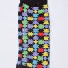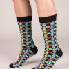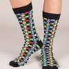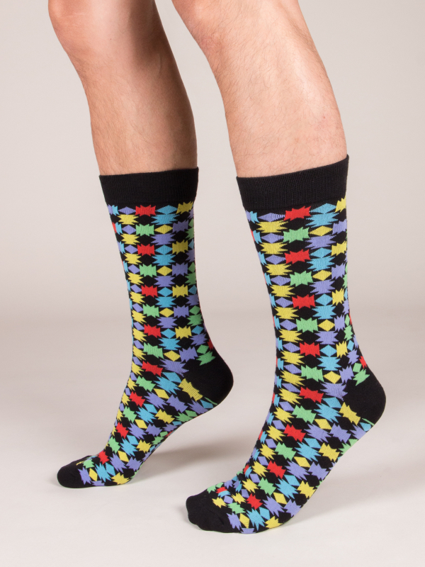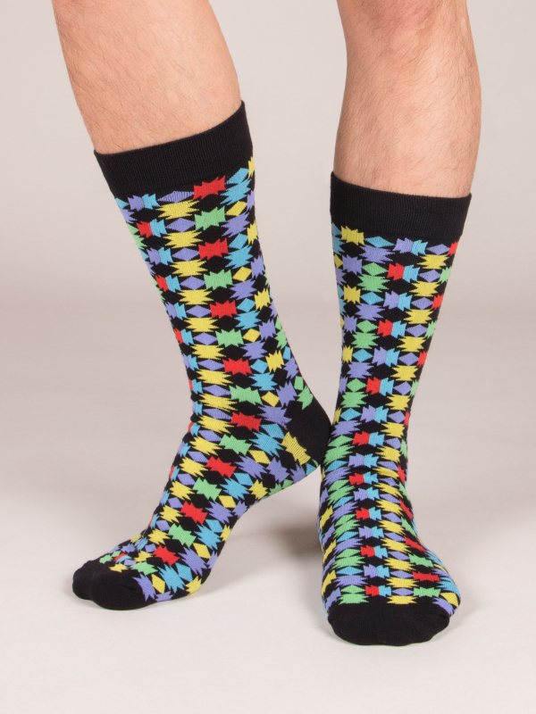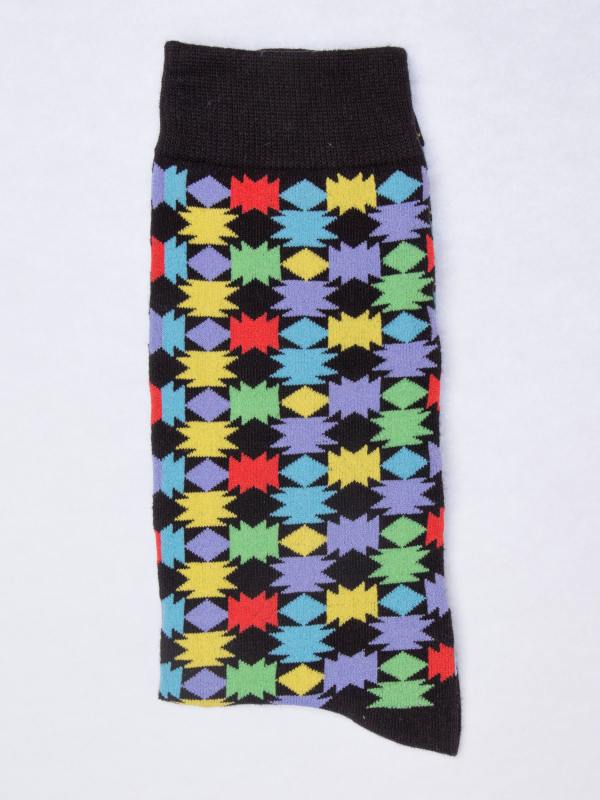 To awake your outfit, opt for these socks with multicolor geometric form pattern. Its flashy colors, perfectly highlighted by the black background will work even better with dark jeans. Its composition will provide you with comfort throughout the day.