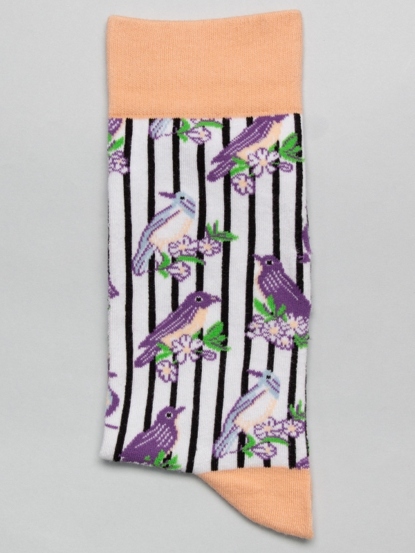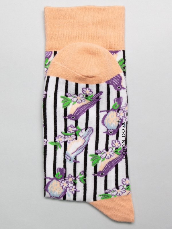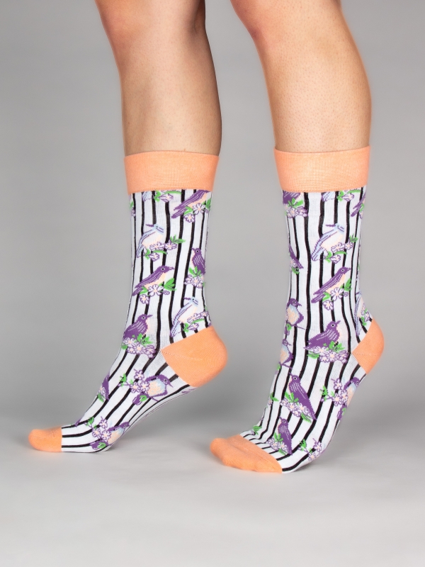 Celebrate the beauty of nature with these enchanting socks adorned with playful tits motifs. Elegantly scattered across the fabric and highlighted by gentle peach accents at the cuffs and toes, they’re ideal for a leisurely Sunday in the countryside. Team them with white trainers to let the charming birds subtly enhance your style.The model wears a size 38-41.