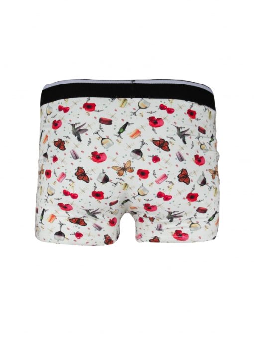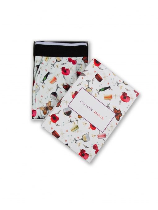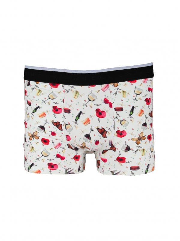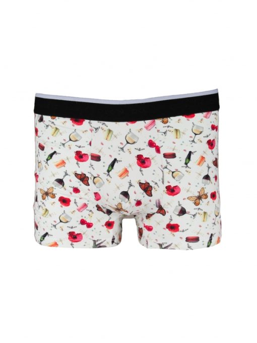 These white background bucolic print trunks are crafted from cotton and a touch of elastane designed for a comfy and soft fit. Take note also of its black elasted waistband for support. They feature a floral natural print as simple pleasures: glass of wine, macaroons, cherries… Just wear it and enjoy the gentle pleasures of life…