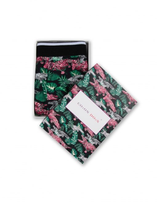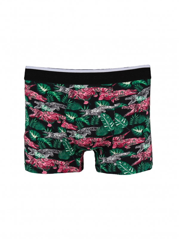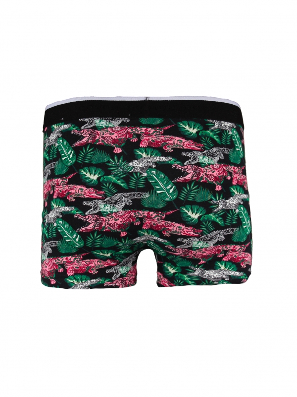 These black crocodiles print trunks are made from cotton and elastane, making you feel like a second skin. They are printed with the hidden white and pink crocodiles in the black and floral and deciduous background and fitted with a black elasticated waistband for support. Be the first one “snapping up” this printed underwear.