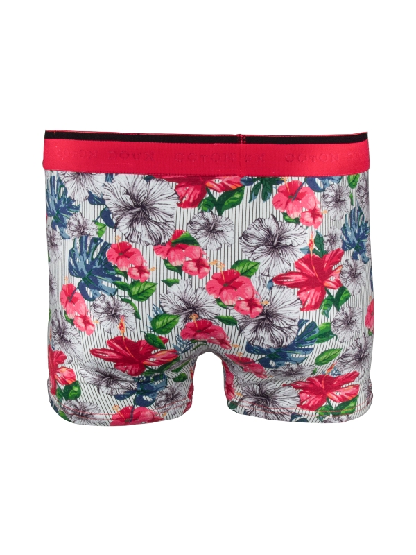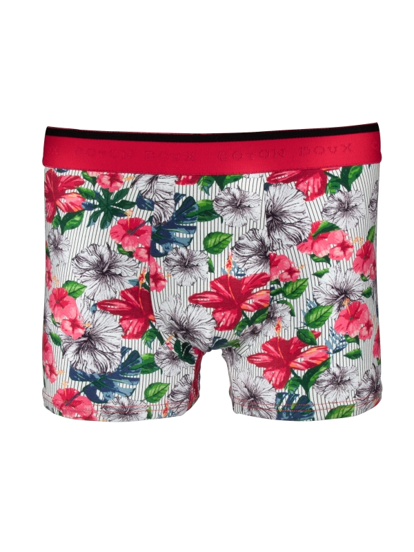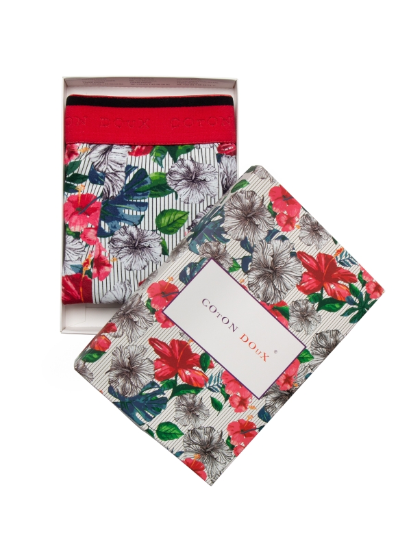 Fashioned from a cotton-elastane blend with flat lock seams and a red elasticated logo waistband, these trunks deliver vibrant comfort with a tropical hibiscus print, adding a splash of exotic flair.