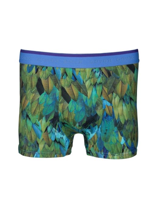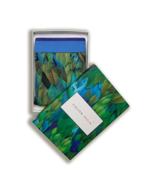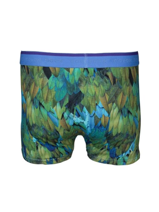 These trunks, adorned with a peacock feather print, are crafted from a premium cotton-elastane blend. Featuring flat lock seams and a blue elasticated waistband, they provide a seamless, comfortable fit. Enjoy exceptional comfort and style every day with these uniquely designed trunks.