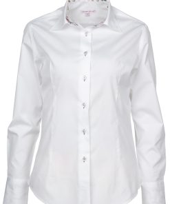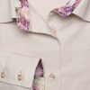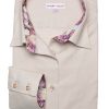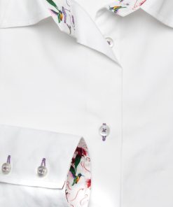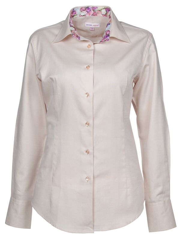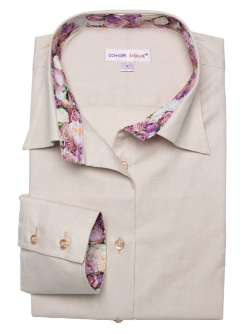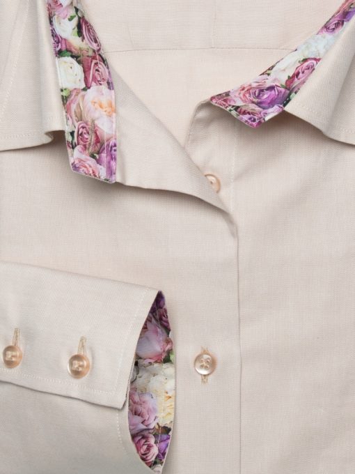 Revitalize your wardrobe with our women’s beige poplin fitted shirt, showcasing a charming roses inner lining print. The neutral beige exterior maintains a timeless elegance, while the vibrant rose pattern inside introduces a delightful floral twist. Designed with a classic collar and double-button cuffs, this slim-fit shirt offers comfort. Can be paired with jeans and ankle boots for a more casual touch.
