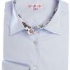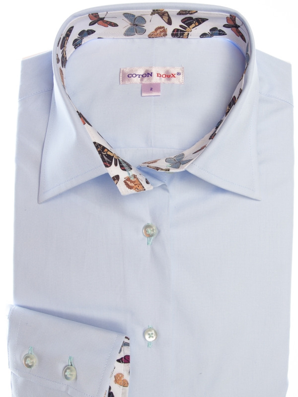 Elevate your wardrobe with this blue poplin fitted shirt, hiding a delightful surprise within a vibrant butterfly inner lining that feels like a secret garden. Designed for a flawless fit, it flatters your silhouette while adding a playful edge. Perfect for the office or a casual outing, it can be paired with tailored trousers or denim.