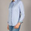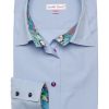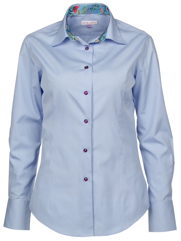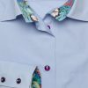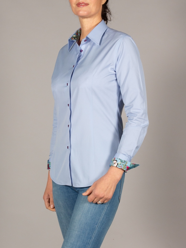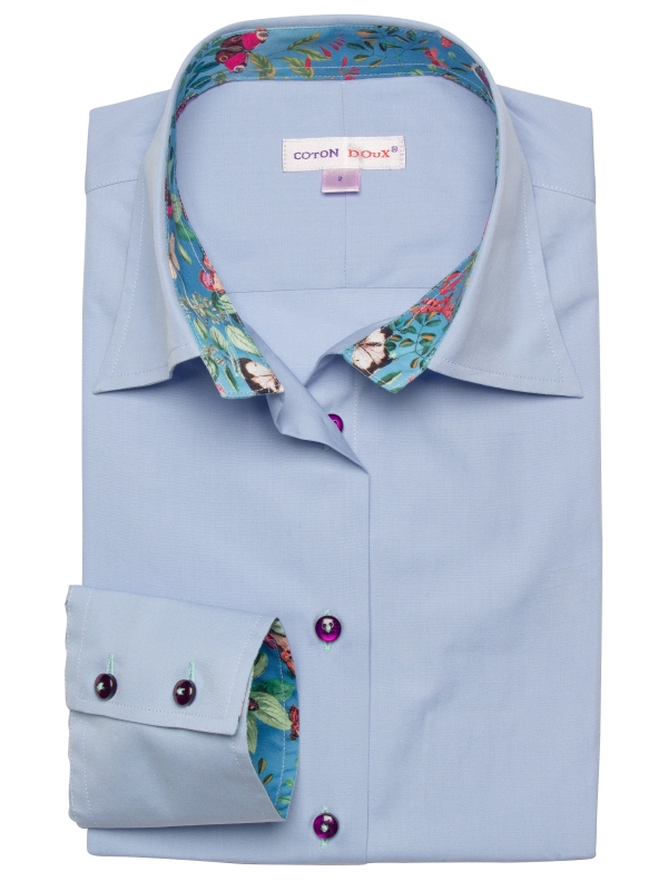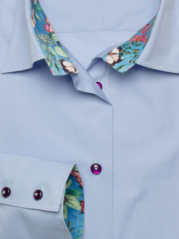 Transform your style with our women’s blue poplin fitted shirt, featuring a charming butterfly inner lining print. The blue poplin exterior is perfectly contrasted by the playful butterfly pattern inside, adding a touch of uniqueness to a classic piece. Designed with a classic collar and double-button cuffs, this slim-fit shirt offers both sophistication and comfort.Pair it with tailored trousers and heels for a polished look.