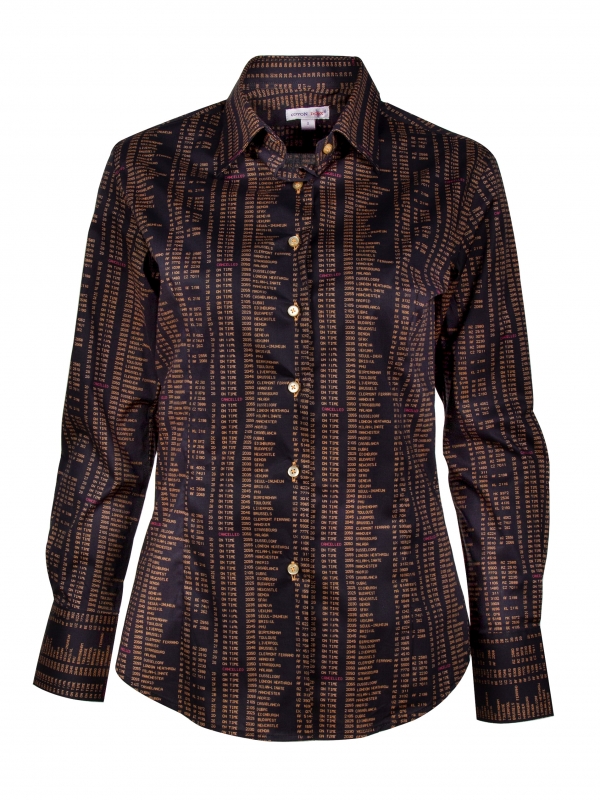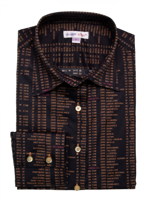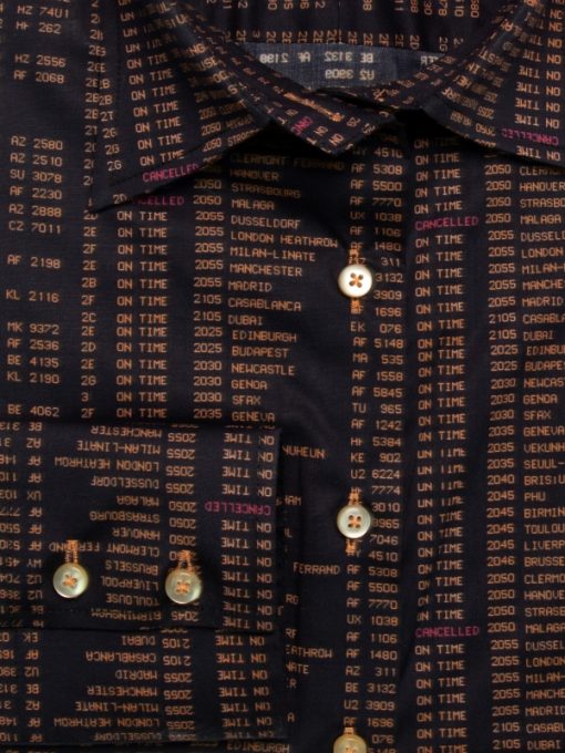 Take flight into a world of trends with this slim fit shirt, featuring a classic collar and double-button cuffs. Its airport billboard print guarantees an atypical, sophisticated style that’s sure to catch the eye of anyone who crosses your path. Wear under a black suit for a confident business woman look, or over denim shorts/black jeans for a more casual look.