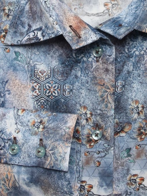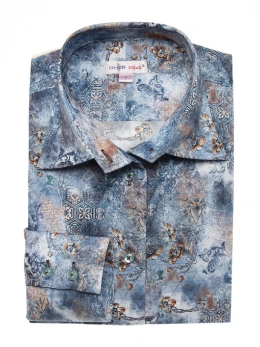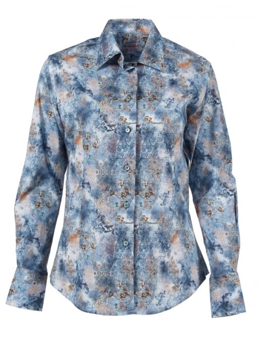 Show your taste for great craftsmanship with this blue mosaic print women’s fitted shirt. The grandiosity will only be better thanks to its classic collar and double button cuffs that meet the rules of the art of the shirt. Its shades of beige on these curves in the baroque spirit will perfectly block with a gray chino or 7/8 pants of the same tone. A final asset, its slim fit. So chic!