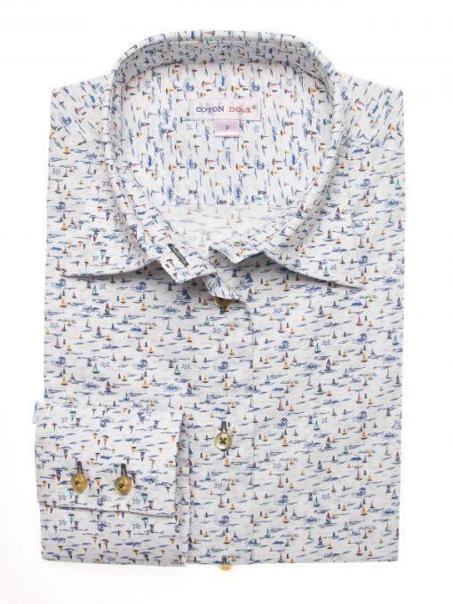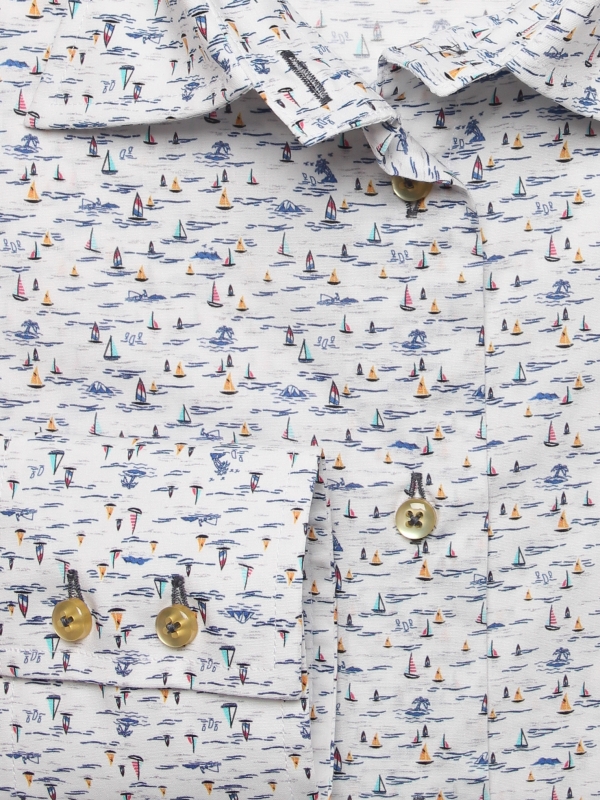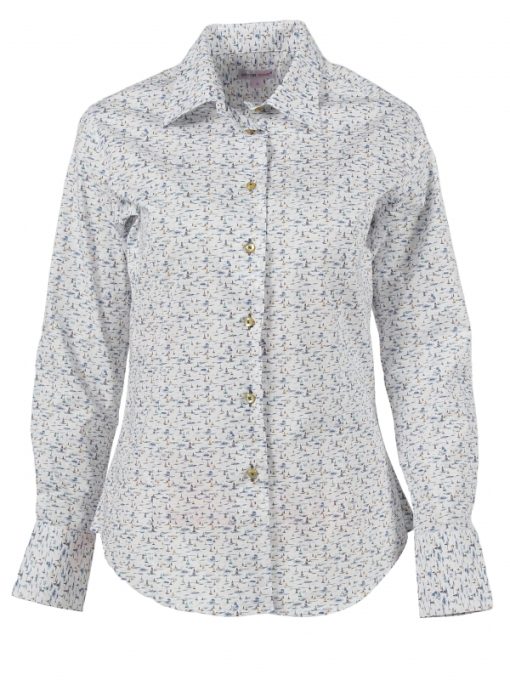 Oh my boat, you are the most beautiful boat! You don’t have to be a professional sailor to want to sail the waves. So let’s board this printed women’s fitted shirt that will convince you with its classic collar and double button cuffs! You can easily match it with jeans or a plain chino, because of the discreet size of the prints and its light colored touches. We’ll let you guess the name of the shoes we suggest you wear… It starts with a B!