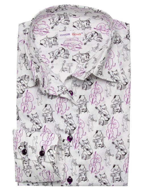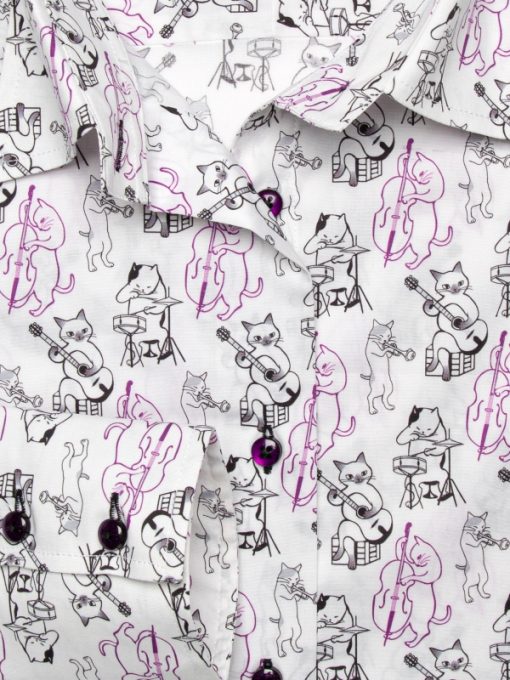 Dive into a world of whimsy with our cats print shirt, where each playful feline musician brings a burst of charm and creativity. The classic collar and double-button cuffs add a touch of refined elegance, while the slim fit offers a sleek, modern silhouette. Perfect for blending fun with sophistication, this shirt pairs effortlessly with slim-fit black trousers and loafers. Make a statement with this delightful design and let your style resonate with feline flair.