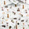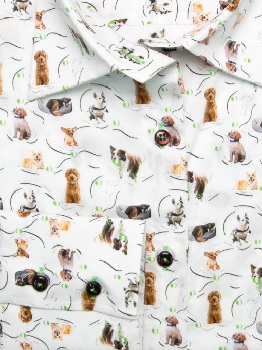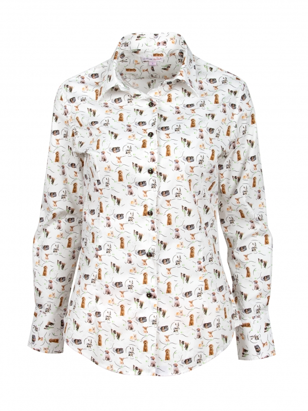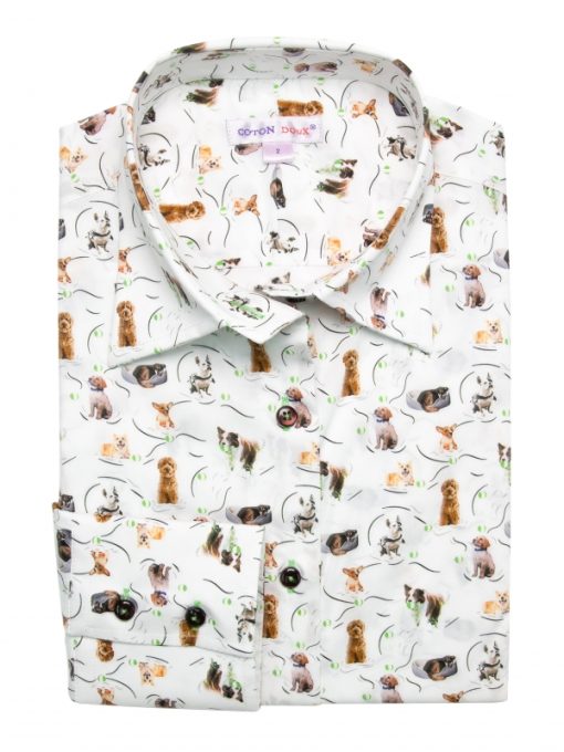 Let your mind wander to a whimsical collection of dogs playfully scattered across the fabric.This women slim fit shirt transcends the ordinary button-up, morphing into a vibrant canine chronicle. A classic collar and polished double-button cuffs provide a foundation of timeless style. But the real eye-catcher unfolds with the whimsical dog print. Take your brunch look up a notch with beige chinos and brown loafers. Add a cable-knit sweater for a touch of warmth and finish with classic sunglasses for a timeless appeal.