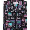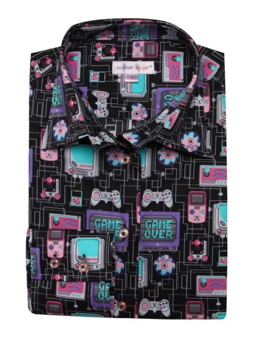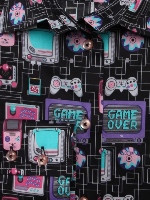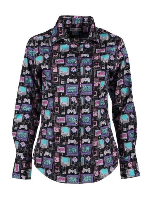 Game girl friends, don’t hide anymore and show your addiction for your favorite games by adding this electronic games print shirt in your cart! Is it about “game over”? It’s all about keeping you on your toes. With its classic collar and double button cuffs you’ll be unbeatable in style. We invite you to be on top of the podium by playing on the marriage of black skinny jeans and a pair of patent derbies to highlight the slim fit and purple hues of this shirt.