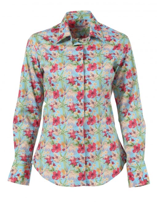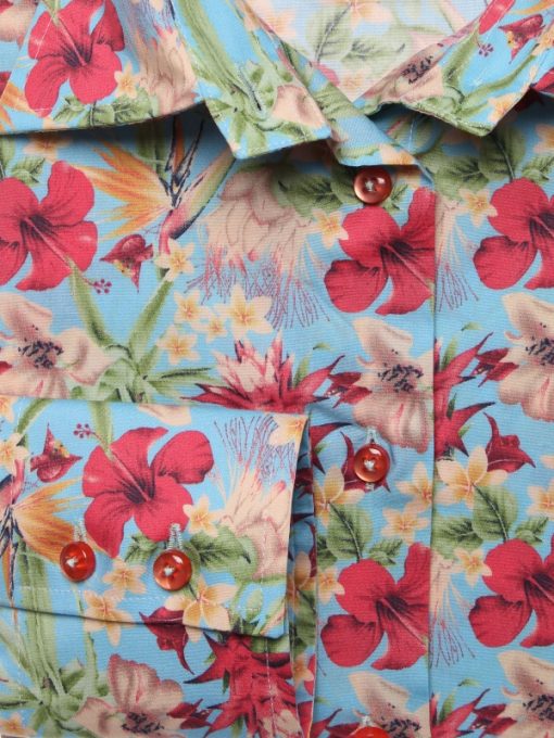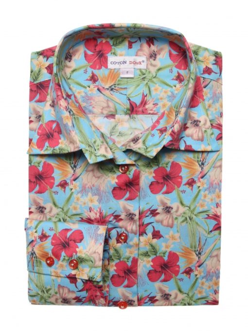 Watch out for your fall-winter wardrobe! By adding this exotic flower print women’s fitted shirt you will shake up your greatest classics! Its bright and summery colors, cyan blue, fuchsia, yellow, green, will light up more than one look on your way but its casual look will not prevent your sense of aestheticism thanks to its classic collar, its double button cuffs and its slim fit. Pair it with a cream cardigan over light denim and the coldest days won’t impact you.