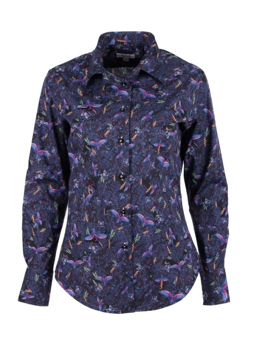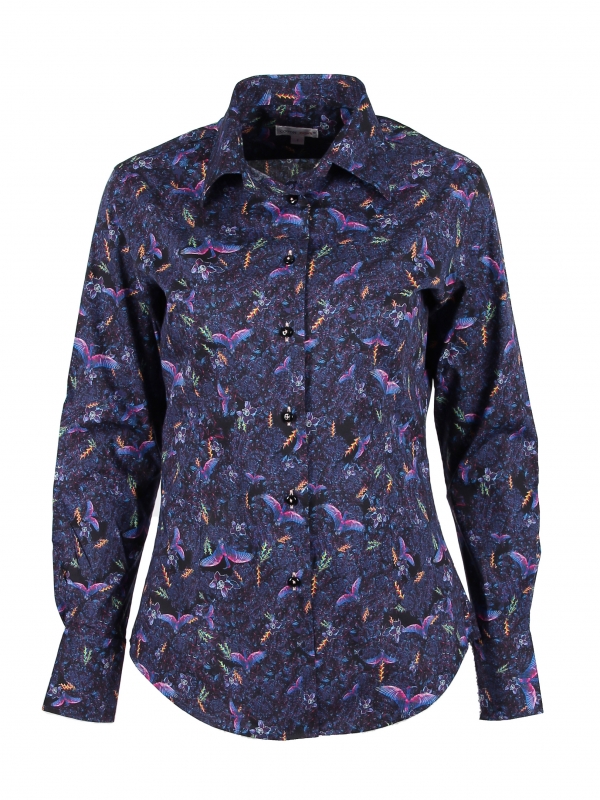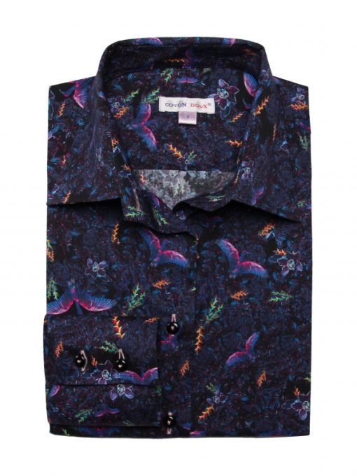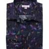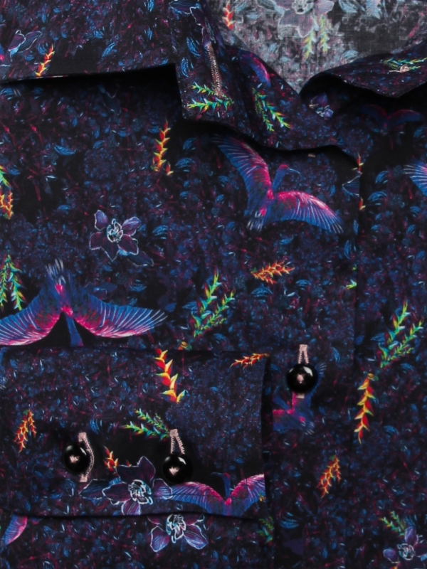 Bring out the poet in you and let yourself be transported to a dreamlike world with the color of these fluorescent birds. The classic collar and double button cuffs of this shirt will extend the journey and you’ll enjoy revealing them without much under a navy suit jacket. Pair the slim fit with powder pink jeans for contrast.