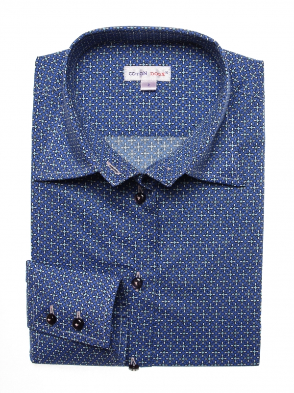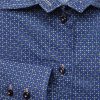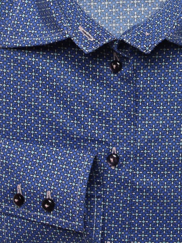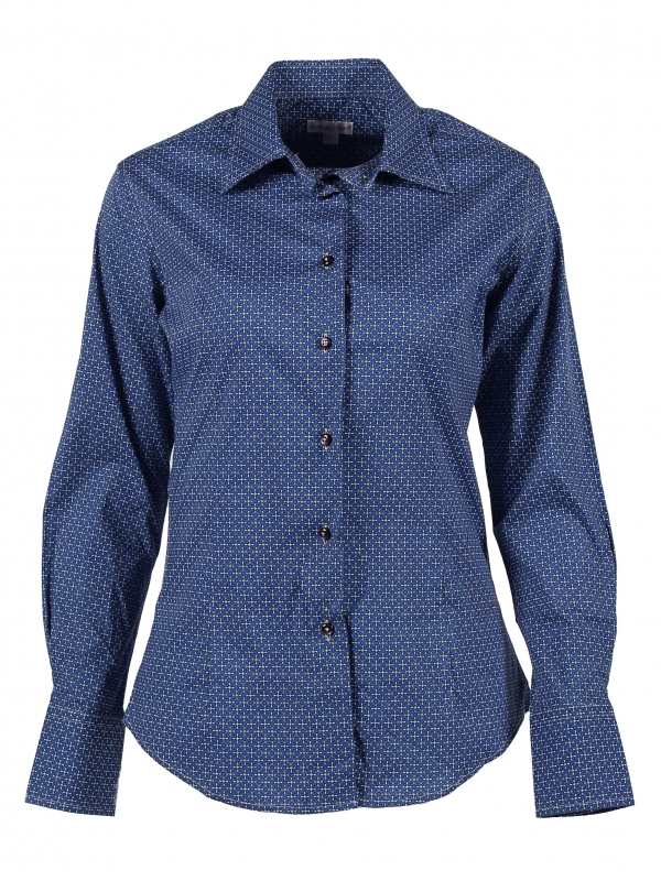 Indulge in the deep illusion of this blue micro-geometric print women’s fitted shirt. You’ll get lost in it with its classic collar and double button cuffs. Be careful, however, not to develop headaches from looking at it. If you want to push the envelope even further, we advise you to add value to this illusion by wearing navy pants for an almost monochrome look. Last but not least, its slim fit that you will just have to appreciate!