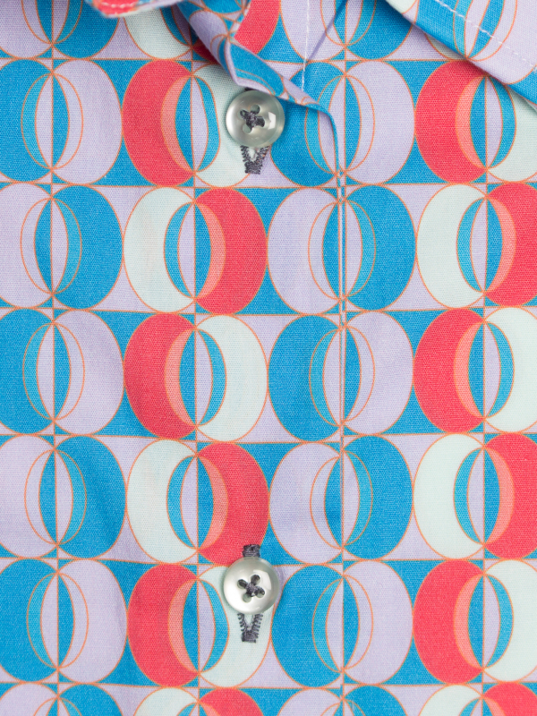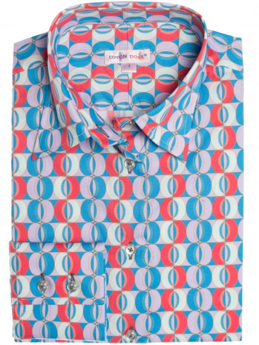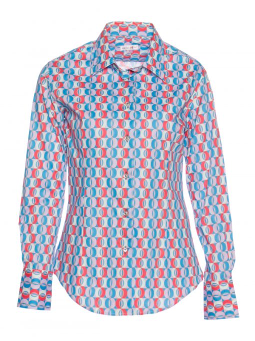 This print with red and blue ovals will dress up your femininity thanks to its curves. The fitted cut of this shirt will do the same and will be perfectly matched with a light-grey blazer. Its classic collar and double-button cuffs are the details that will confirm its elegance.