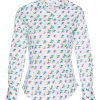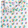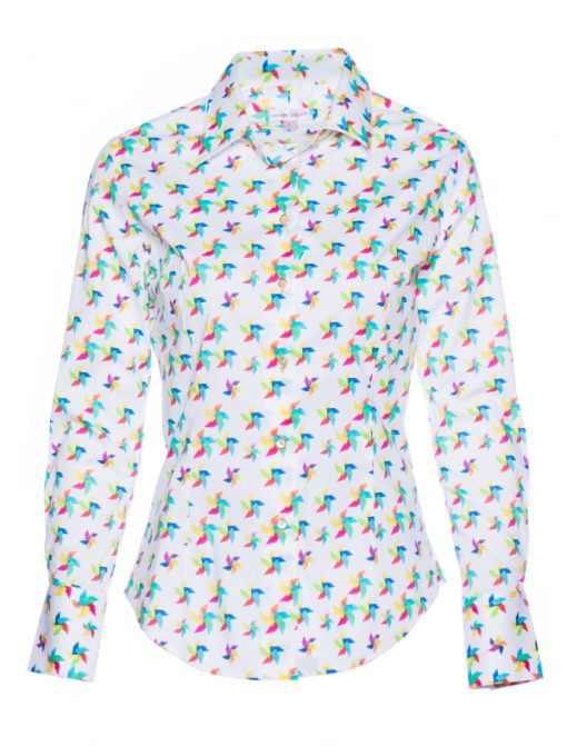 Let the wind of style blow on this slim fit shirt with windmill print. Its vividly colorful touches on the white background will brighten up any outfit, for example mustard trousers and sandals. Its classic collar and double-button cuffs will give you a burst of elegance!