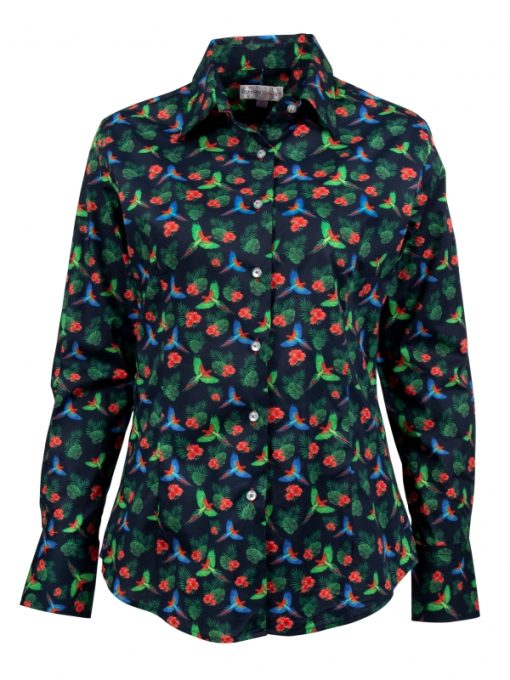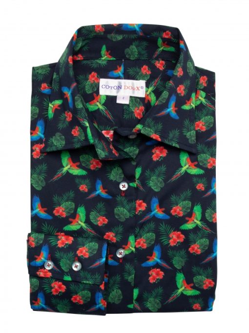 Dreaming of traveling to colorful horizons? Brighten your days with this parrot-print shirt that will provide you with a taste of adventure and whimsy. Featuring a classic collar and double-button cuffs, this shirt showcases a tailored fit to bring out a tropical and sunny ambiance. To add a touch of escapade, opt for olive corduroy pants and brown leather ankle boots with fringe details. You’ll be ready for a tropical escapade, even without leaving your daily routine!