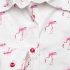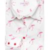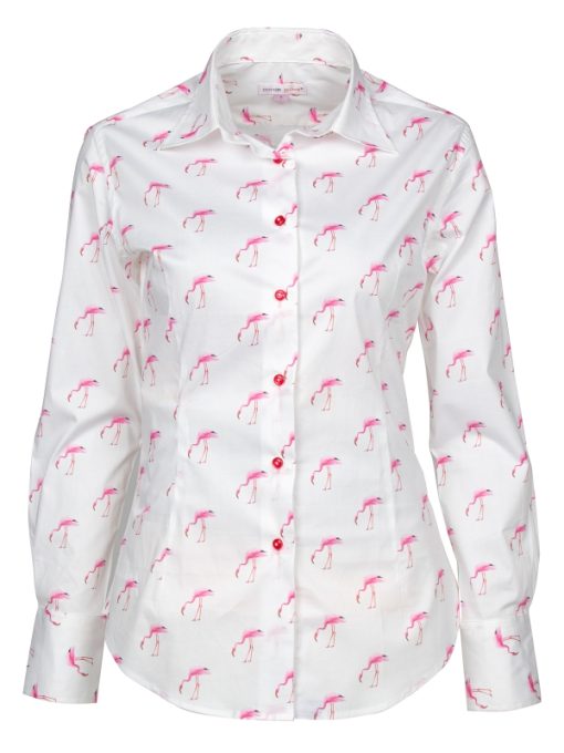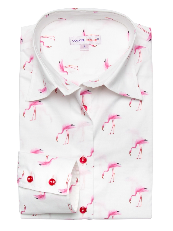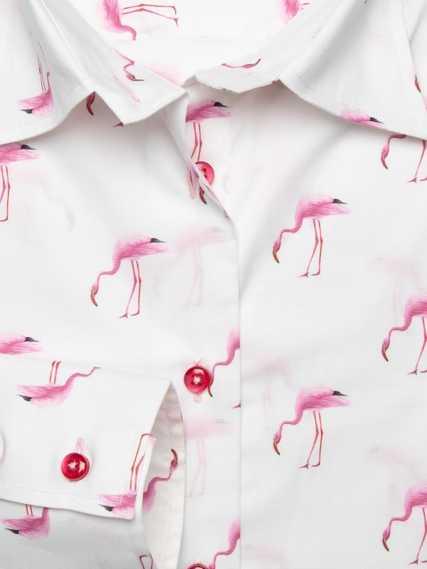 Discover the charm of the tropics with our flamingo printed shirt. The classic collar and double-button cuffs provide a sophisticated edge, while the slim fit offers a modern, streamlined look. The white background beautifully showcases the vivid print, making it a perfect match for grey chinos and casual white sneakers or grey espadrilles. Elevate your casual ensemble with this shirt, blending elegance and whimsy effortlessly for a standout appearance.