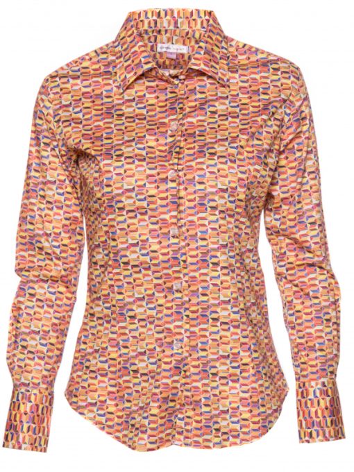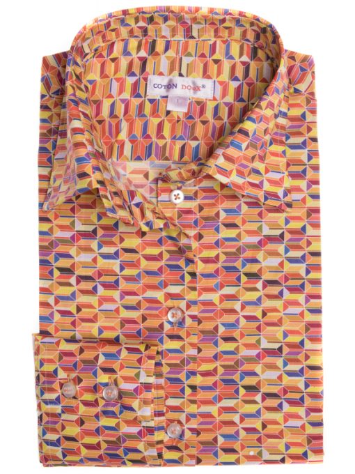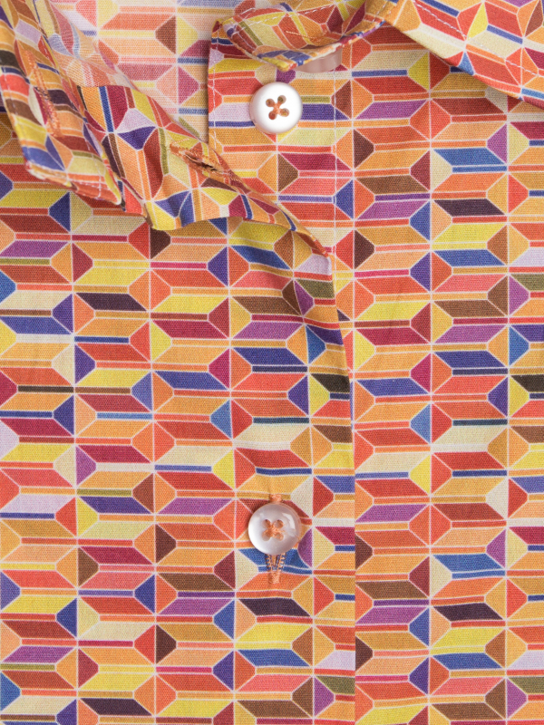 This retro geometrically printed shirt is perfect for making any day gloomy disco. Mixed with a brown twirling skirt, its warm colours will take on their full meaning and give you a luminous glow! What else? Its classic collar, double button cuffs and sharp, slim fit.