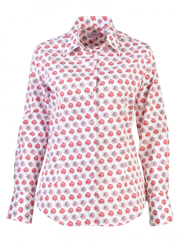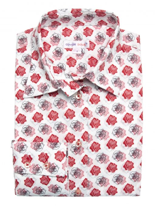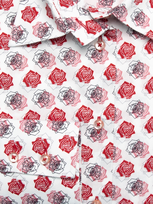 If minimalism is at the top of your wardrobe, here’s a way to combine it with atypism! These pretty red and pink roses with a white background will make a difference without going overboard when matched with white jeans and white sneakers. The classic collar, double-button cuffs and slim fit are all there! Red heels can give you a daring touch and bring more lovelier to the whole outfit… Try it!
