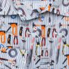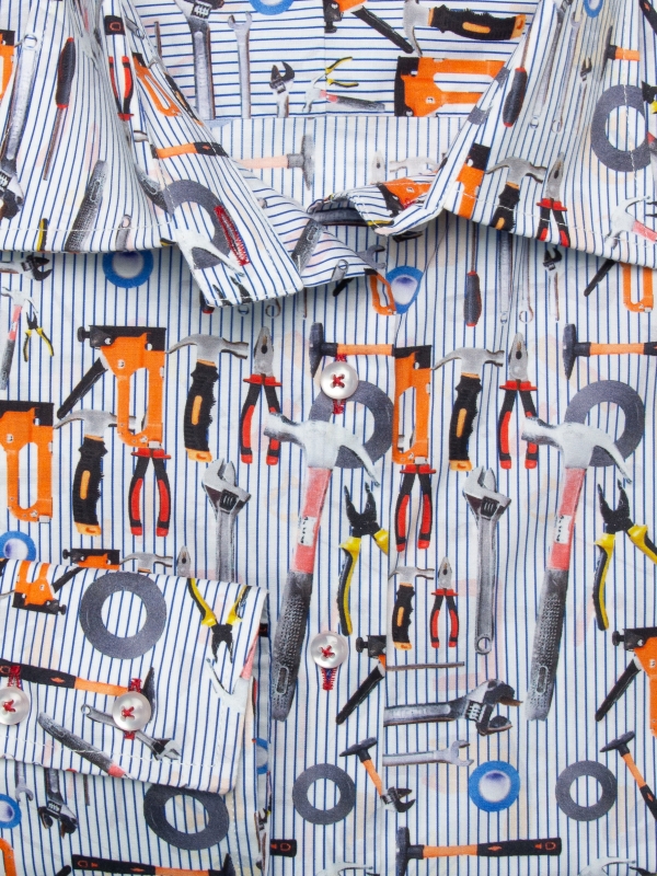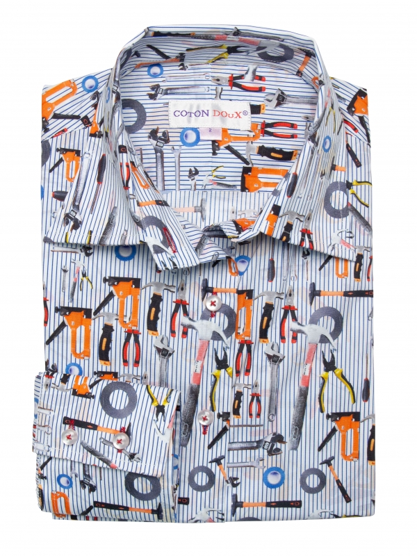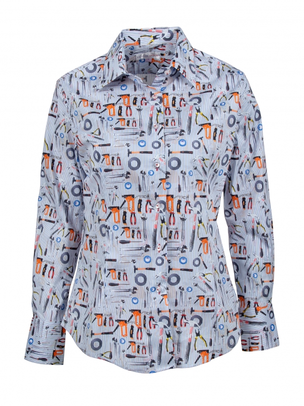 Discover this tool-print shirt that combines ingenuity and elegance, and give it the key to unique style! Featuring a classic collar and double-breasted cuffs, this shirt has a flattering slim fit. Pair it with grey canvas cargo trousers for a very working girl look and black leather ankle boots for added contrast. For a slightly less casual look, slip on a navy blue blazer and raw denim jeans, keep the black ankle boots on and let this perfect wardrobe ‘kit’ shine.