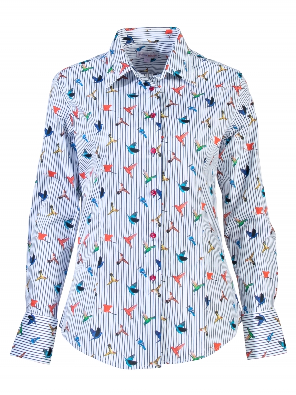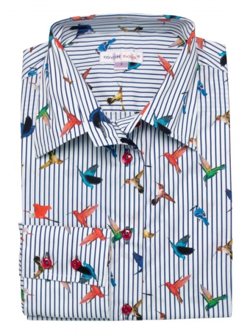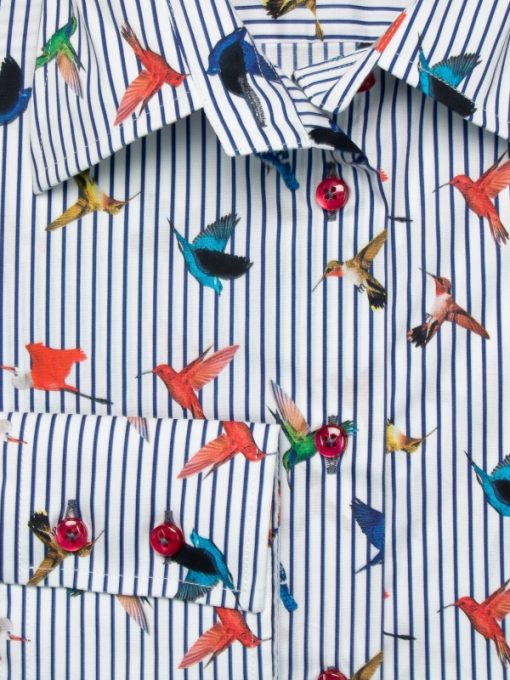 A striped shirt to change your daily life? Look far away and add brightly coloured hummingbirds on either side, like this print. As well as bringing a touch of originality, you’ll appreciate its adherence to the rules of classicism: classic collar, double-button cuffs and slim fit. A navy suit pants would be a perfect match especially with white sneakers for a casual look.