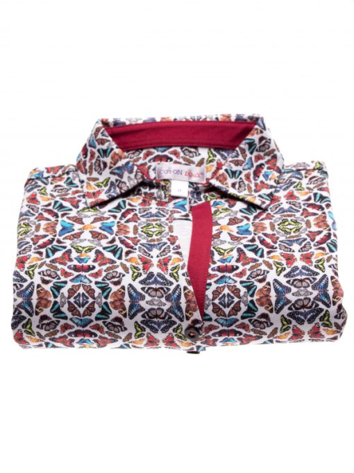 Wait a minute ! Take the time to observe the details of this polo shirt : slim fit, triple buttons and cotton piqué collar… In addition to these worked finishes, for a maximum comfort, you will appreciate the design and the optical effect of its multicolored butterfly print. On a raw denim skirt and a pair of brown spartans shoes you will just have to appreciate its softness thanks to its cotton jersey.