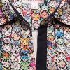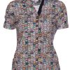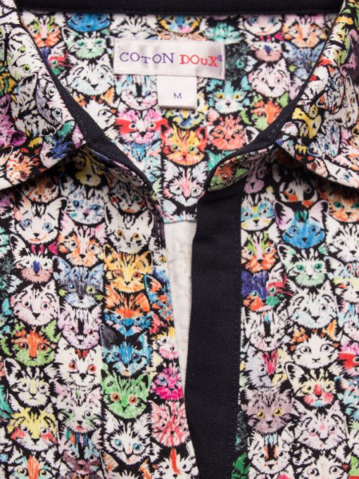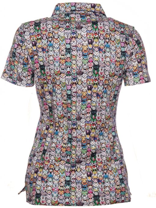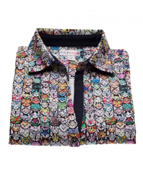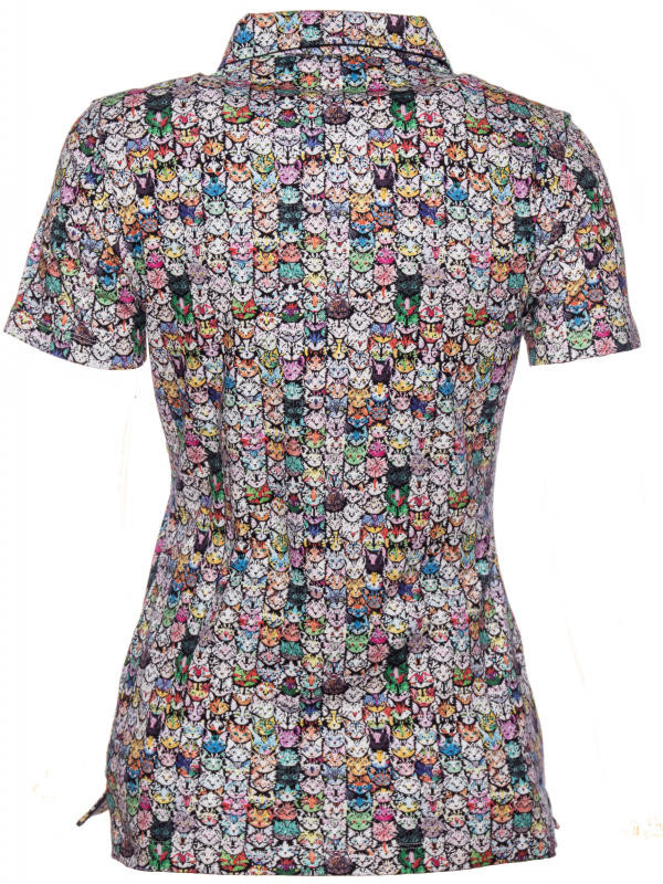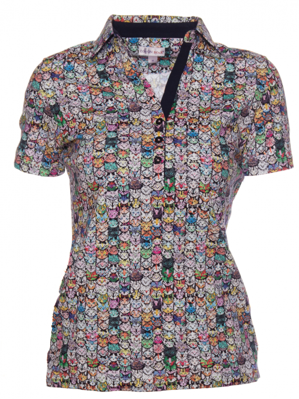 Let yourself be charmed by these small colored felines with this polo shirt in cat print. As soft as it is graceful, you will fall for it as well as its mercerized cotton jersey composition. Its fitted cut will bring a touch of lightness, ideal with grey slim jeans, while the three-button placket will show your feminity.