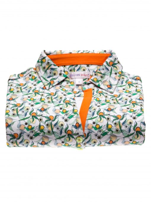Is your dressing room running out of freshness? There’s nothing better than this polo shirt with mirabelle print to give it a fruity touch. In cotton jersey, its comfort will be as elegant as its visible elegance thanks to its slim fit cut, its cotton piqué collar and its triple buttons. If you want to shine, wear it with white trousers to illuminate the outfit and a pair of platform espadrilles.