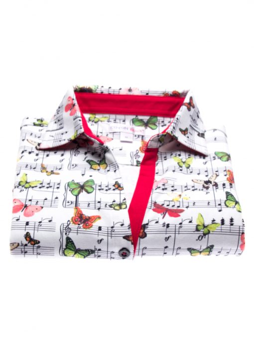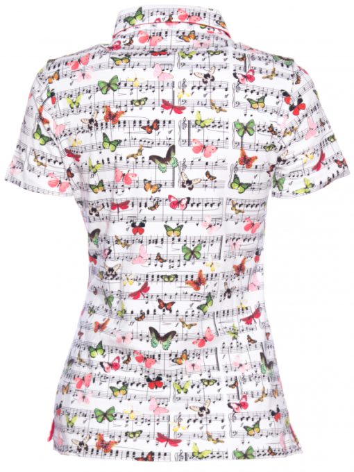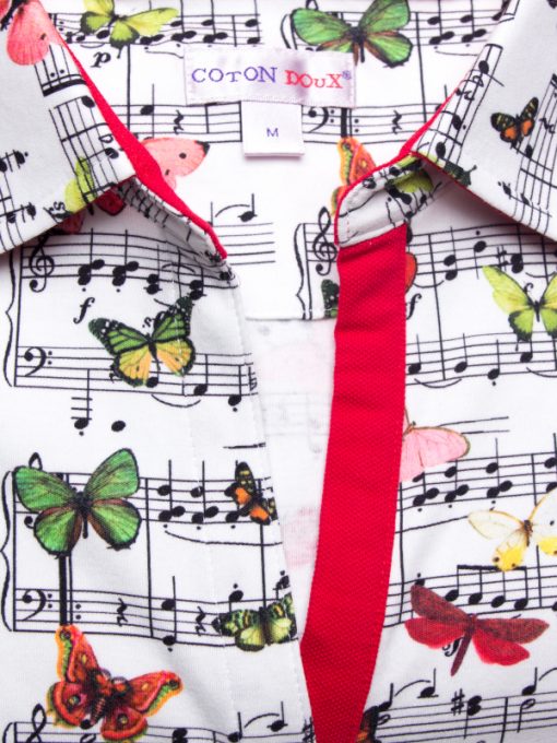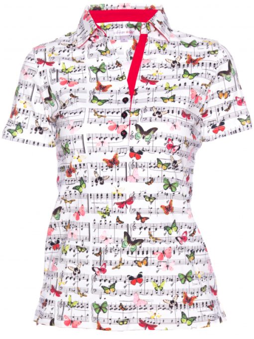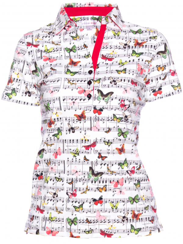 Make your day a beautiful melody with this Women’s slim fit polo with music sheet print. The colors on a white background make this mercerized cotton jersey polo shirt your best ally for a feminine look. Between chic and casual, you won’t have to choose anymore thanks to its piqué collar and its three-button placket.