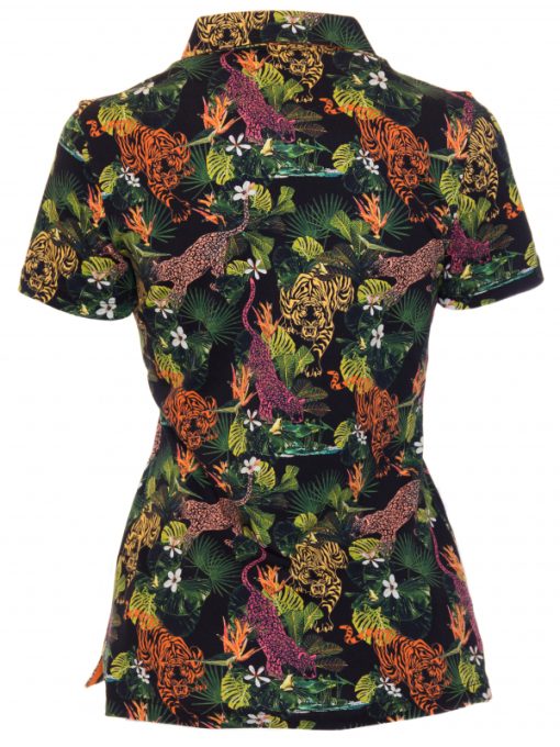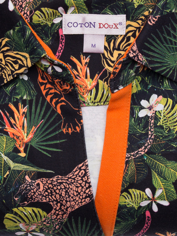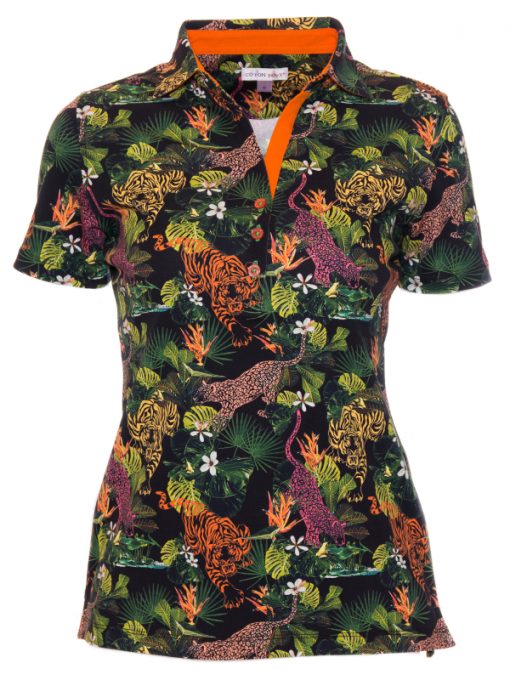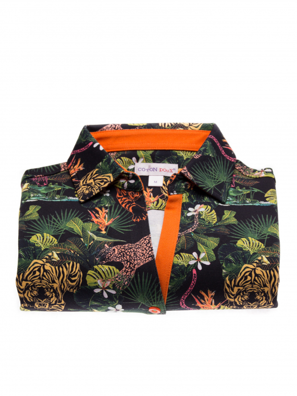 The jungle is trendy! The tiger and flowers print will give a touch of tropical feelings for your outfit. Match this slim fitted polo shirt with black jeans and orange espadrilles in order to play with the color of the cotton piqué collar. Other details are the slim fit cut,three-button placket and made with jersey of cotton. The perfect look for the hot days!