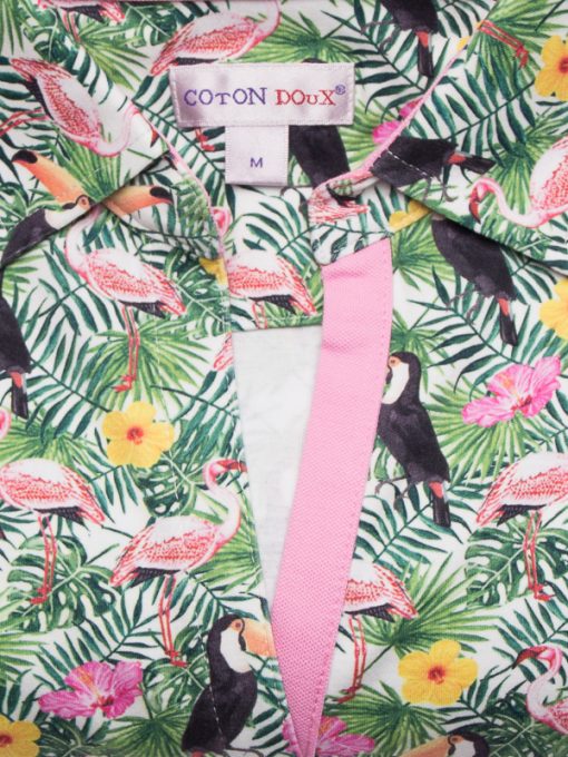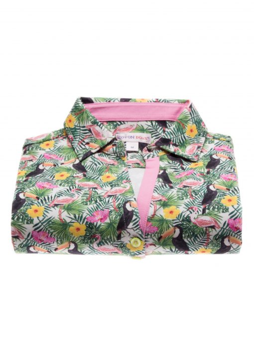 Nothing better than a tropical bird print to decorate this polo shirt in jersey of cotton? Toucans and flamingos cohabit happily and will be perfectly highlighted on white linen shorts. A decontracted look but also elegant grace of its piqué collar, three-button plackets, its lines and its regular fit. Its composition will provide you softness.
