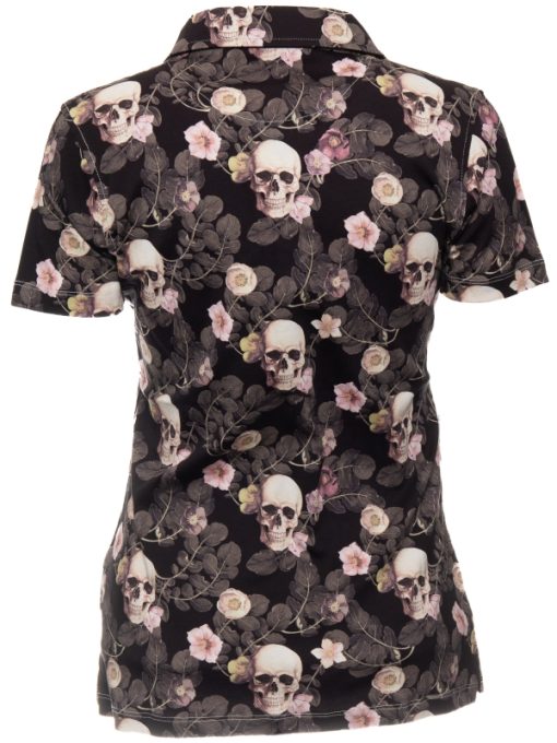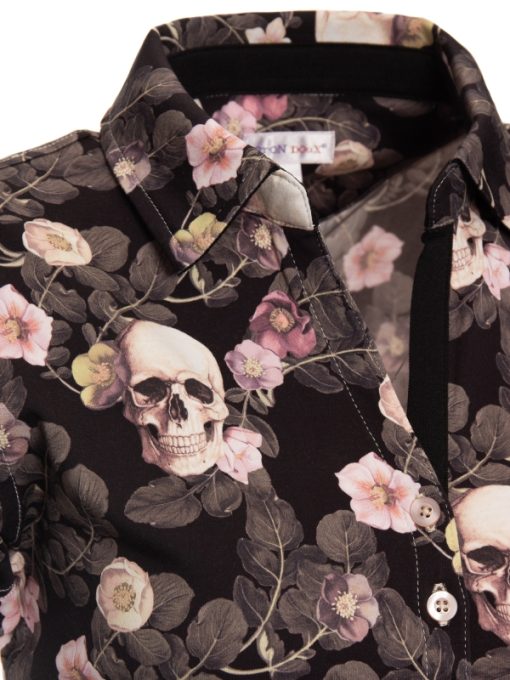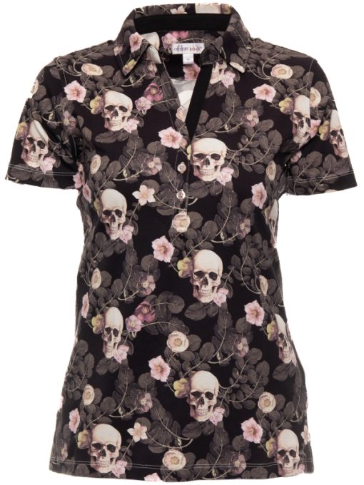 A striking fusion of mystery and elegance, this polo features an intricate pattern where finely drawn skulls are delicately intertwined with soft, pastel-hued flowers and foliage. The dark black background adds depth and drama to the composition, creating a sophisticated and artistic statement piece. Designed with a slim fit, it contours beautifully to the body, while the cotton piqué collar and three-button placket bring a touch of timeless refinement. The mercerized cotton jersey fabric offers a velvety smooth touch and an impeccable drape.